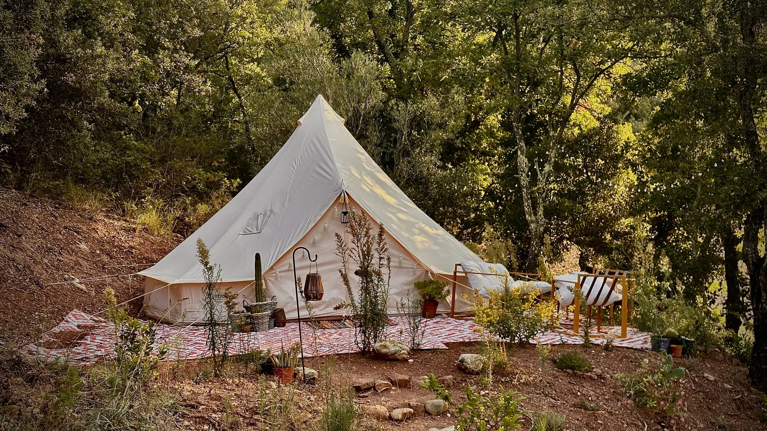 Chaque tente dispose d’un lit double, et de deux lits simples (ou d’un coin détente), d’une terrasse privative, le tout avec vue sur les Maures.